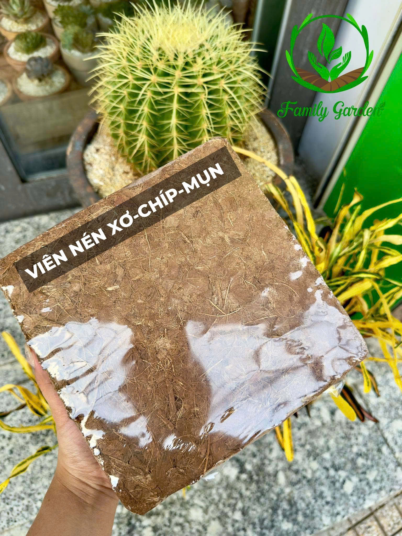 - Nguyên liệu chính là mụn dừa từ vỏ dừa già khô. Sản phẩm viên nén xơ dừa nhà Family Garden được sản xuất từ các mụn dừa đã qua xử lý khiến các chất chát (lignin và tanin) gây xót cây bị loại bỏ hoàn toàn, được nén chặt và bọc bởi lớp màng co.