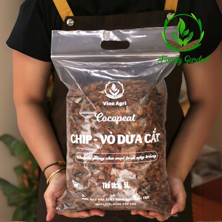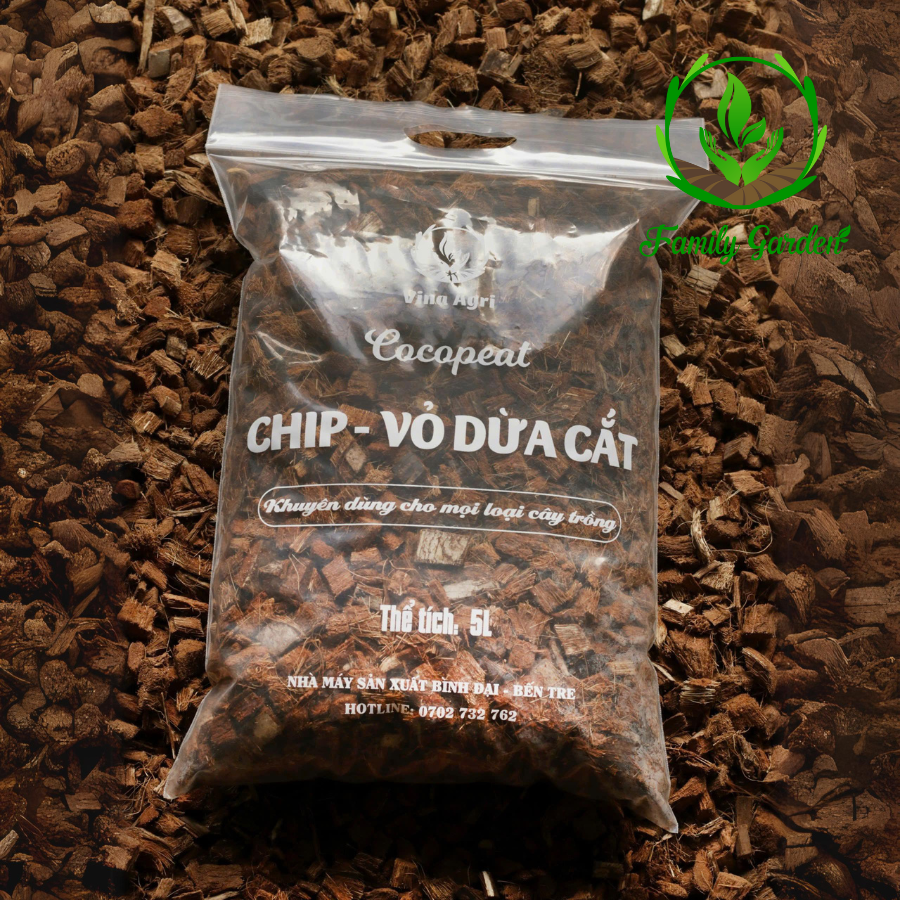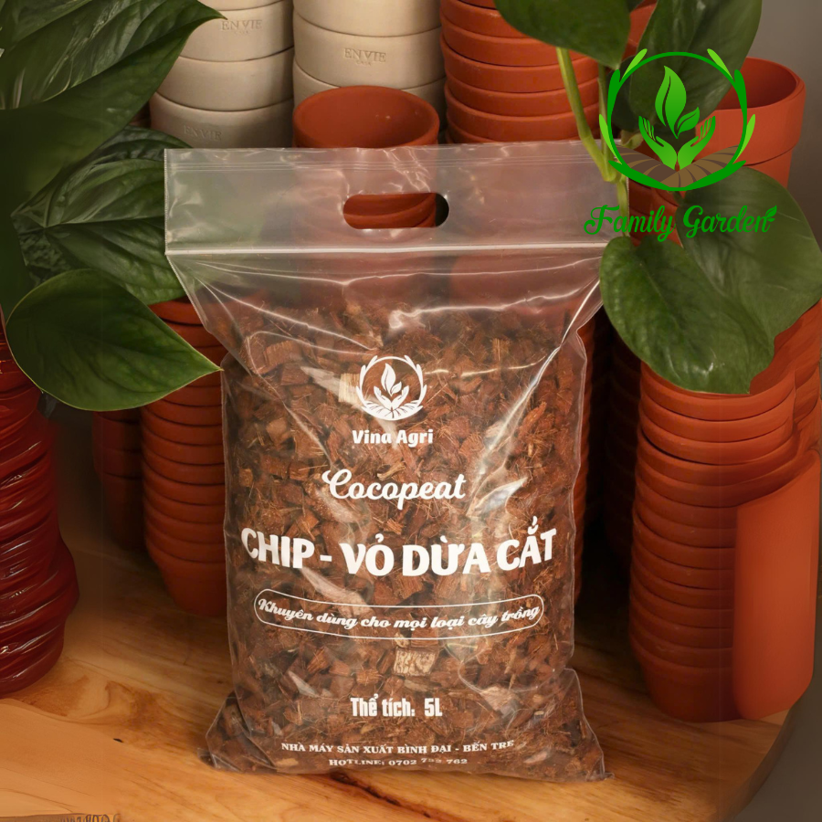 - Vỏ dừa cắt hay còn gọi là coco chips thuộc thương hiệu Vina Agri độc quyền nhà Family Garden đã qua xử lý sạch mầm bệnh, xử lý mặn là chất trồng phổ biến và được ưa chuộng bởi khả năng thoáng khí, chống nóng, và giữ ẩm tốt, đặc tính xốp nên có khả năng thoát nước tốt giúp cây trồng chậu tránh ứ đọng nước gây úng.