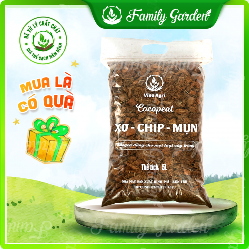 - Nguyên liệu chính là mụn dừa từ vỏ dừa già khô. Sản phẩm túi 5L xơ chip mụn dừa nhà Family Garden được sản xuất từ các mụn dừa đã qua xử lý khiến các chất chát (lignin và tanin) gây xót cây bị loại bỏ hoàn toàn, được đóng túi tiện lợi.